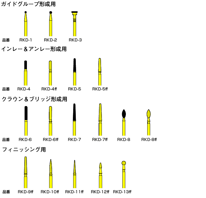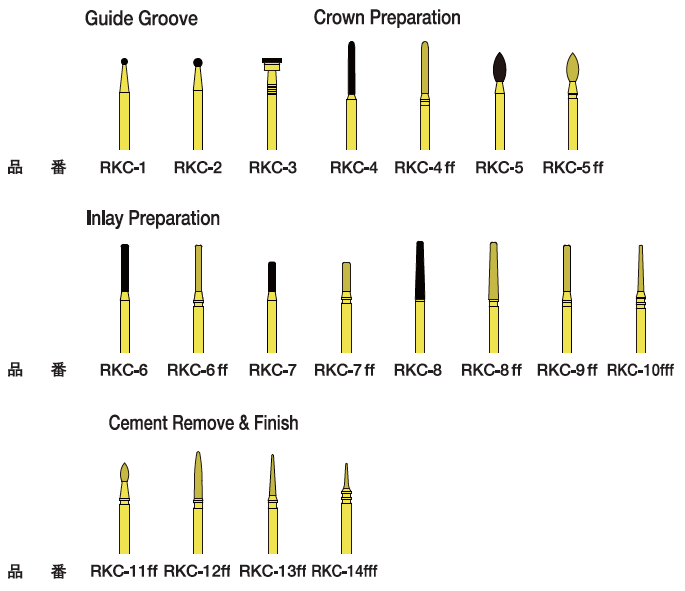 特徴Digital Dentistry Prep Setは歯科用CAD/CAMシステムによる各種セラミック修復、CAD/CAMレジン冠に適した支台形成を行うためのダイヤモンドポイントのセットです。