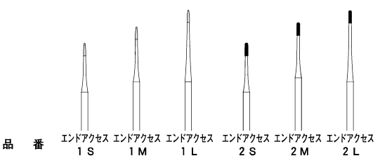 エンドアクセスバーは、エンドアクセス1、エンドアクセス2があり、それぞれに長さS(24mm)、M(28mm)、L(32mm)があり、計6種類あります。また、バーの先端3mmだけにダイヤが付いています。これによりマイクロスコープで使用する時に視野を妨げる事なく、安全に狙った部分だけを確実に削る事ができます。