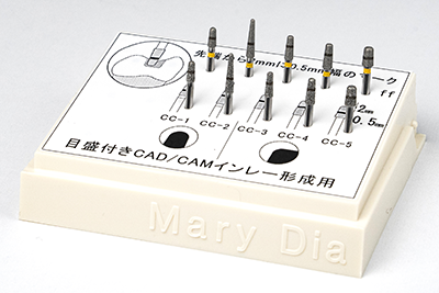 そこでバーのダイヤ部に直接目盛を付けることで窩洞の垂直方向の深さを測りながら形成できるセラミックスインレー用ダイヤモンドバー「マーク」を開発しました。