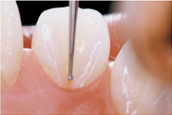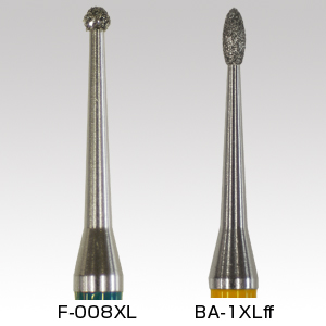 秋山のバーは、従来のインスツルメンテーションより正確・安全でMIなカリエス治療を行えるバーであり、また不用意な露髄に対し安全に作業が行えるように1ミリ刻みでラインが入っている。どのくらいの深度で削合しているのか確認しながら作業が行える。 |