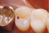 軟化象牙質を完全に除去した咬合面観。 |